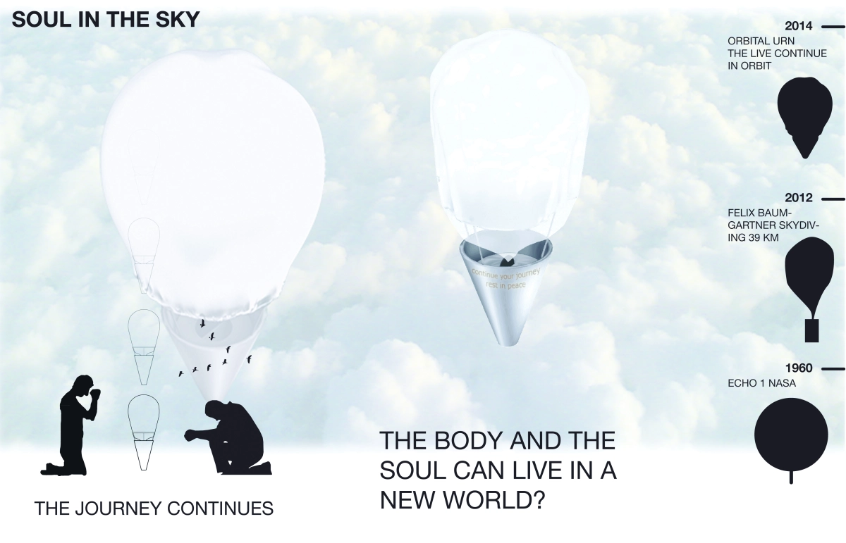 «Душа в небе» — это проект архитектора из Италии  Диего Стефани и троих его студентов, который они представили общественности в 2013 году. Он представляет альтернативу традиционным формам похорон. Идея Диего Стефани заключается в использовании стальной урны с прахом умершего, которая отправляется на небо и поднимается на высоту 900 км в экзосферу. Урна передает GPS-сигнал о своем местонахождении и прикреплена к воздушному шару, наполненному гелием. На поверхности урны выгравированы дата смерти, имя покойного и эпитафия. В контейнер с урной установлена сигнальная лампа, которая может быть воспринята как звезда или пролетающий спутник. Новый проект предлагает символическое вознесение души на небеса вместо традиционного погребения тела.