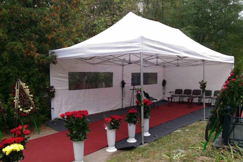 - Организация мест для прощающихся: шатры, скамейки и подставки для венков.